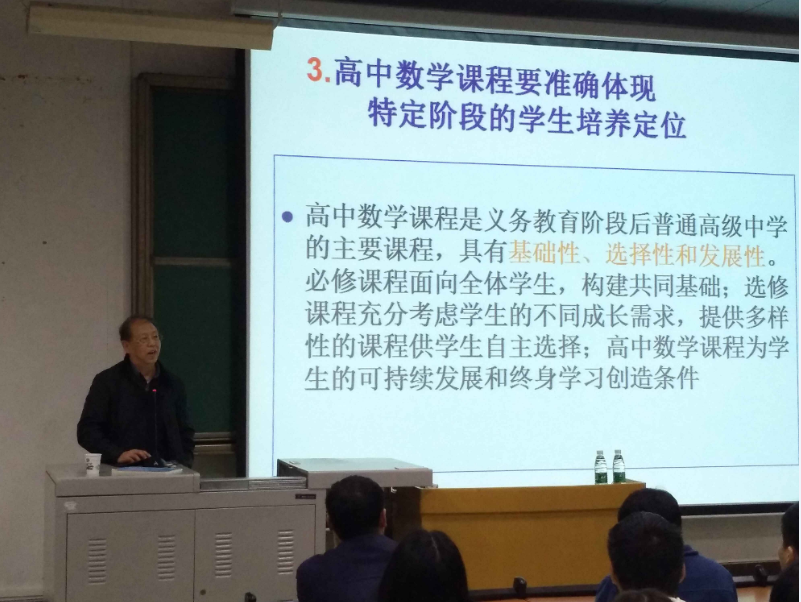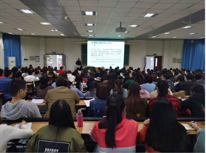 3月28日下午,重庆师范大学原副校长、博士生导师、教育部《国家课程标准》研制专家组成员、国家中小学教材审定审查委员黄翔教授莅临我校做题为:《高中数学课程标准(2017年版)》解读的专题讲座。黄翔教授围绕培养什么样的人、怎样培养人这一主线,详细解读了高中数学课标修订的背景与意义、高中数学课程的性质、高中数学课程的基本理念、高中数学课程内容的设置、数学核心素养的内涵。黄翔教授特别指出,未来高中数学部分选修课程要与音乐、美术、体育等学科交叉融合,这对大学师范教育提出了新的挑战,他殷切的希望学生们能努力学习,不断提升自己素养,为适应未来数学教育挑战作好准备,讲座中黄翔教授还回答了部分师生提出的问题。数学与财经学院2014级、2015级、2016级师范专业学生以及数学系部分教师参加了讲座,讲座让与会师生领略到了黄翔教授的知识渊博和学术魅力,了解了中小学数学教育的前沿内容。