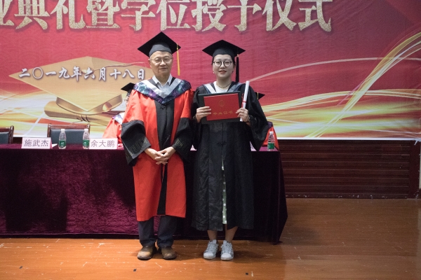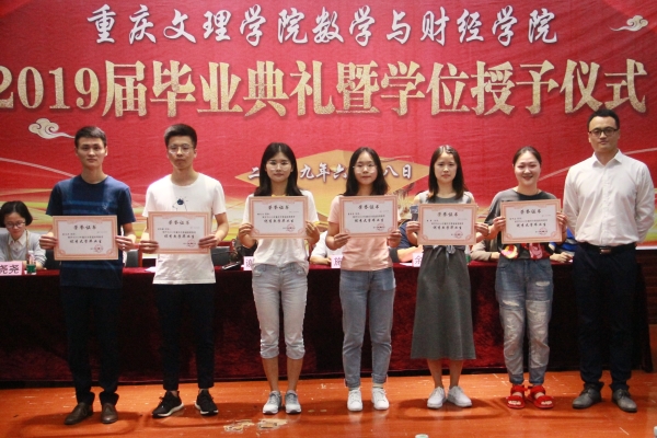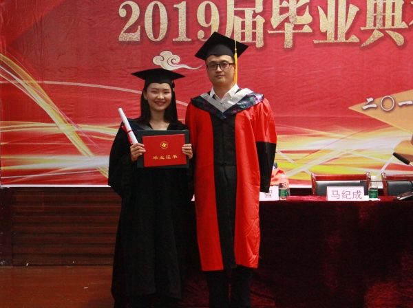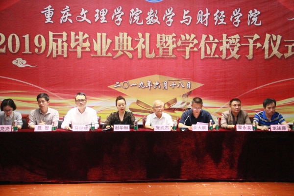 典礼在庄严的国歌中拉开帷幕。首先是观看毕业视频,一起回顾了毕业生们从入校到毕业的欢乐和成长,再次聆听学生敬重的施武杰老师、马纪成老师对毕业生们临行前的深情寄语。学院名誉院长施武杰教授随后发表致辞,对即将毕业的同学们表示祝贺,并给予同学们“行你所行,不畏西东”的人生寄语。校友部秘书长谢华琳老师随后为校友联络员一一颁发了聘书。马纪成副院长随后宣读《重庆市教育委员会关于公布2019年普通高等教育优秀毕业研究生和优秀大学毕业生名单的通知》,并为市级优秀毕业生颁发荣誉证书。学院总支书记余大鹏教授宣读《关于表彰2019届校级优秀(良)毕业生的决定》,并为校级优秀毕业生、优良毕业生颁发荣誉证书。马纪成副院长宣读《重庆文理学院关于准予2019届魏丽娟等5221名应届生及刘子涵等33名往届生毕业的决定》。最后,施武杰教授和马纪成副院长分别为毕业生一一授位,并合影留念。毕业典礼在欢快庄重的校歌中结束。