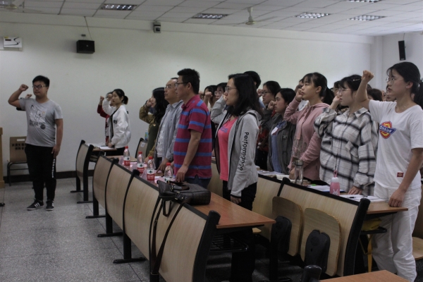 4月21日上午9:00,学员们在知津楼D205参加了本次团校开班典礼。在大家齐唱了中国共青团团歌后,雷袁鑫带领全体学员重温入团誓词。随后,李虹瑾为学员宣读了本次团校的管理办法以及相关要求。宣读结束后,主持人李星翰就团校的课程安排进行了介绍。之后,余大鹏为本次团校开班致辞,并向学生代表授旗,宣布团校正式开始。