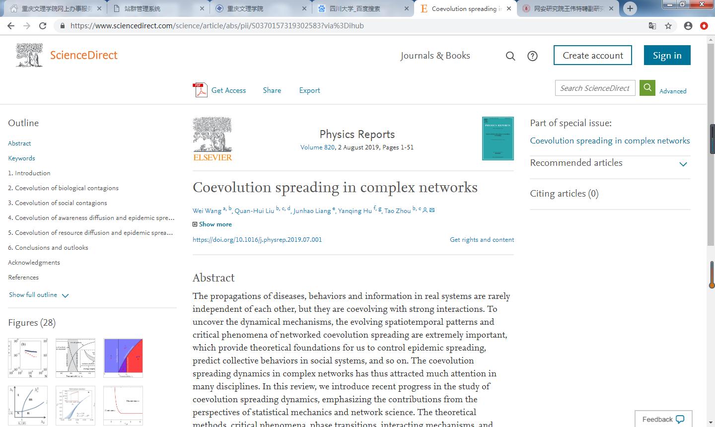 近日,英国上市公司3652011届信息与计算科学专业校友、四川大学网络空间安全研究院王伟特聘副研究员与电子科技大学、中山大学合作,在《物理报道》(Physics Reports) (影响因子28.2)发表题为“复杂网络上的共演化传播”(Coevolution spreading in complex networks)长篇综述论文。王伟为论文第一作者,四川大学网络空间安全研究院为第一单位,这也是四川大学在《物理报道》上首次发表论文。