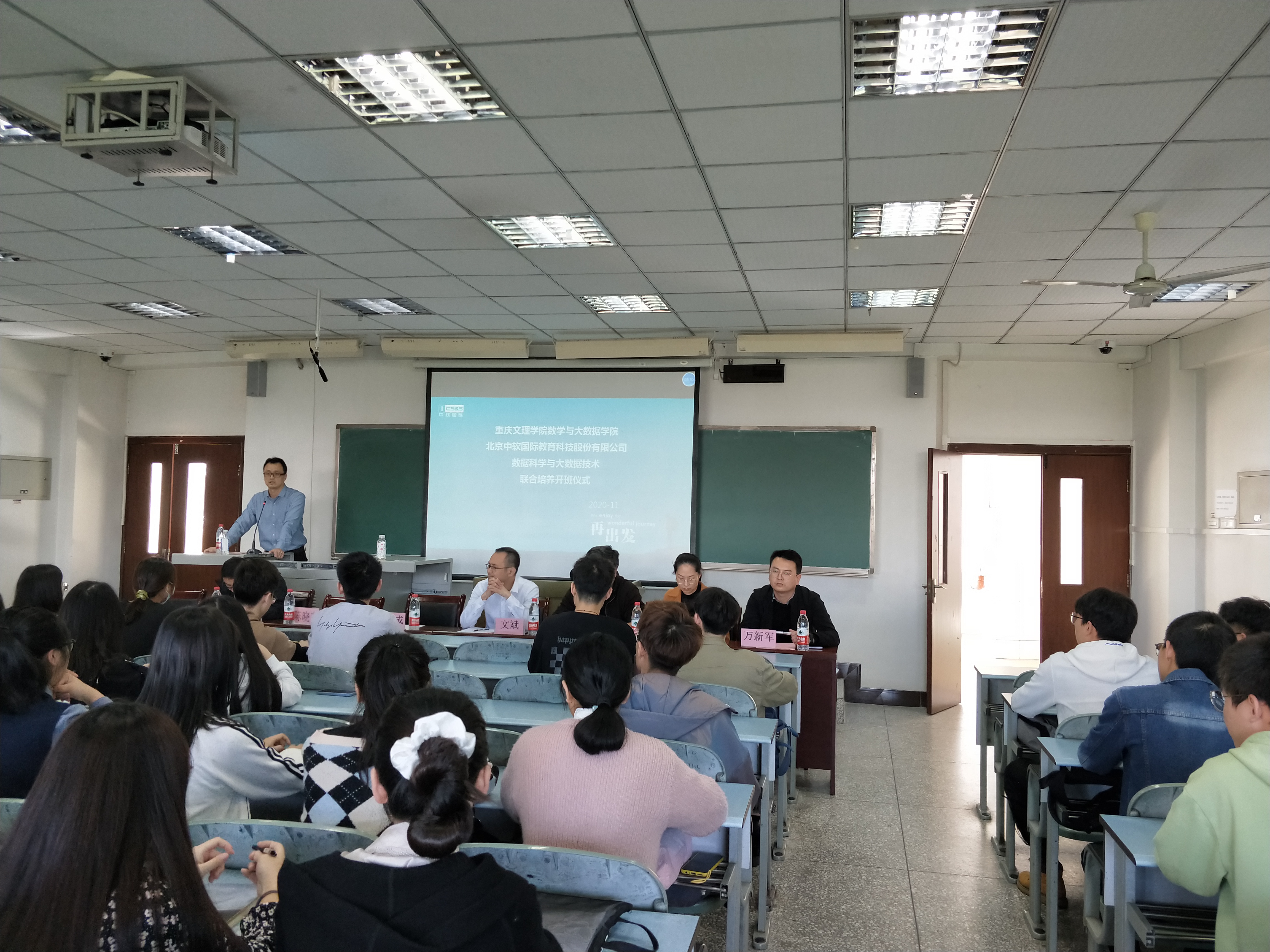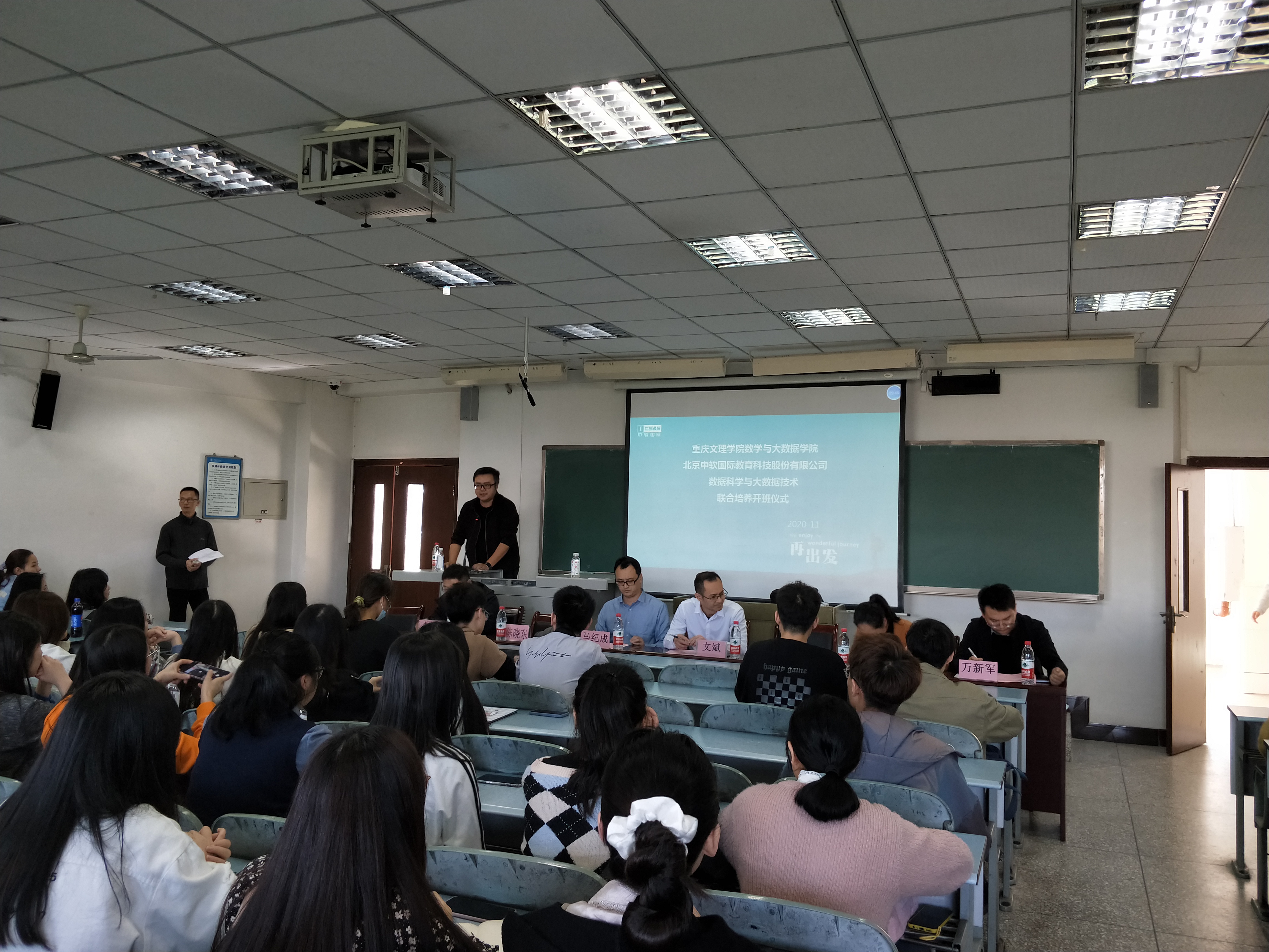 2020年11月11日下午14:00,在重庆文理学院红河A区知津-D404,开展重庆文理学院中软国际数据科学与大数据技术专业联合培养开班仪式。出席开班仪式的有数学与大数据学院执行院长马纪成、中软国际教育科技股份有限公司西南片区总经理文斌、技术总监朱映、院校总监万新军、高级工程师赵雷、职业发展总监蔡珍珍,开班仪式由数学与大数据学院副院长陈晓东主持。