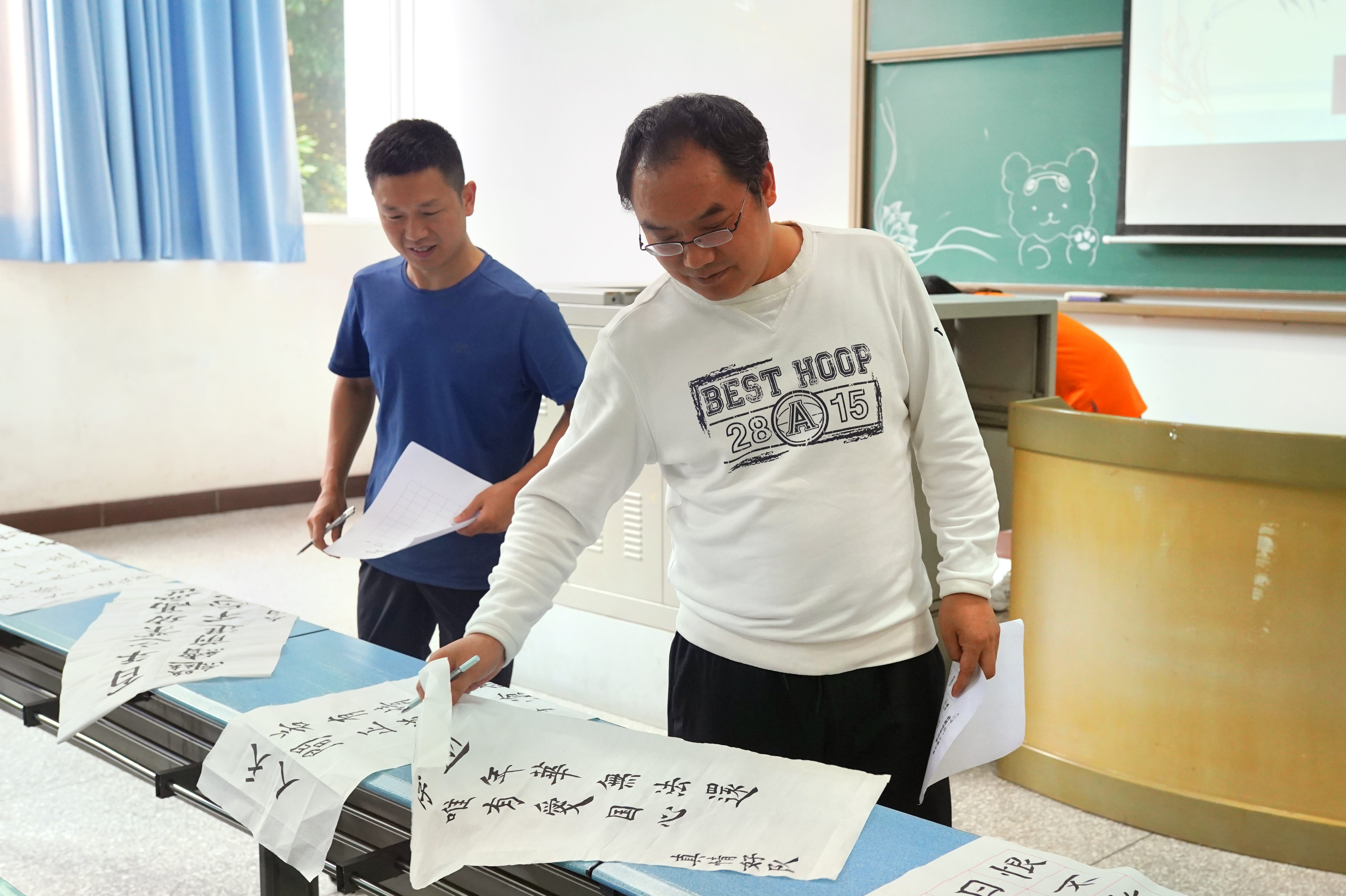 决赛分为三项内容。第一项内容,小组展示:由半决赛晋级的九个小组各派一名代表同学围绕决赛前提交的毛笔字和粉笔字作品内容做演讲,同时,各小组现场书写毛笔字作品,演讲和书法作品由各评委评分后按比例算总分并排小组名次;第二项内容,教师点评:付天贵老师作为代表老师上台发言,对参赛选手提出了演讲和书法书写一些建议;第三项内容,颁奖典礼:本次大赛,获得一等奖的是好运来队;获得二等奖的是小鲜ru队和行云流水队;获得三等奖的是太白静心队、关东组队和金英大哥队。获得优秀奖的是风月无边队、张雨贺队和真情好队。
