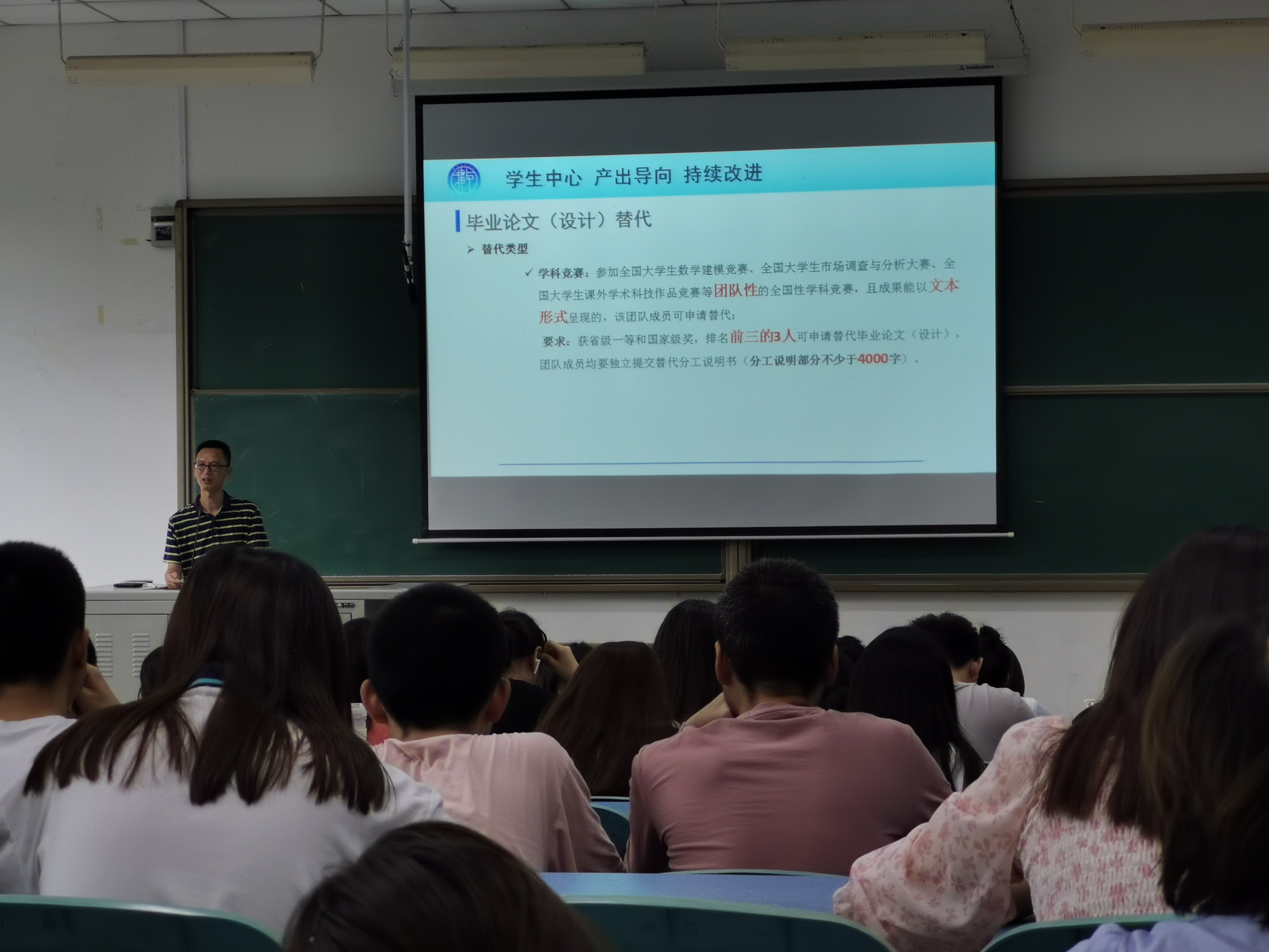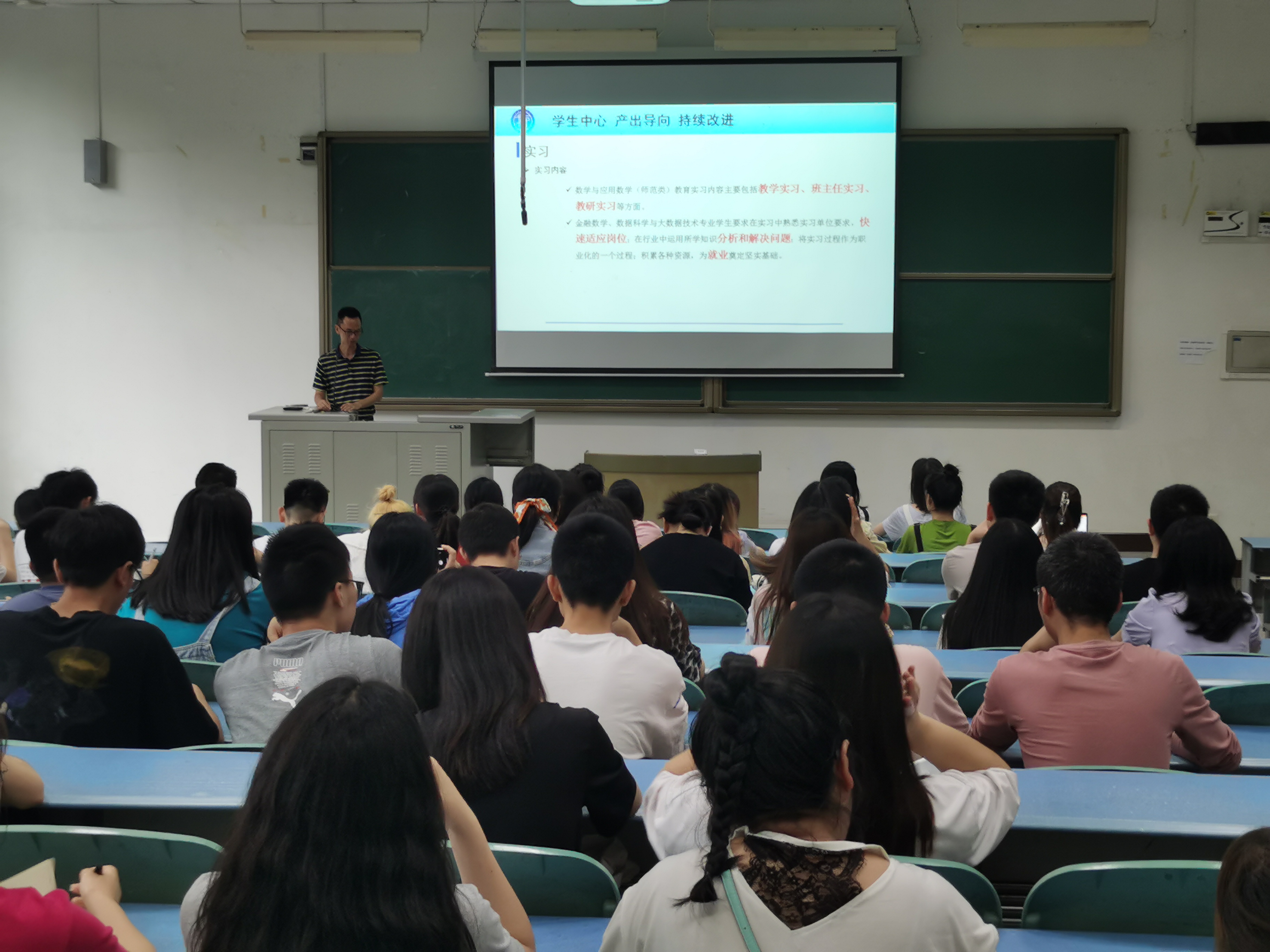 首先,副院长陈晓东做毕业实习工作安排,对师范实习、非师范实习、考研延迟实习等做了具体的安排,对实习过程的管理,实习结束要交的材料做了详细说明,调动了各位同学的实习积极性,也帮助同学们增强了信心以及安全意识,为即将开展的实习工作打下基础。然后陈院长对毕业论文(设计)工作安排。他对毕业论文(设计)中的各环节时间节点如完成初稿、教师评阅、送外审专家、交叉评阅、毕业论文答辩等进行说明,希望同学们高度重视毕业论文相关工作,慎重选题,认真研究,用心撰写,提高研究能力。