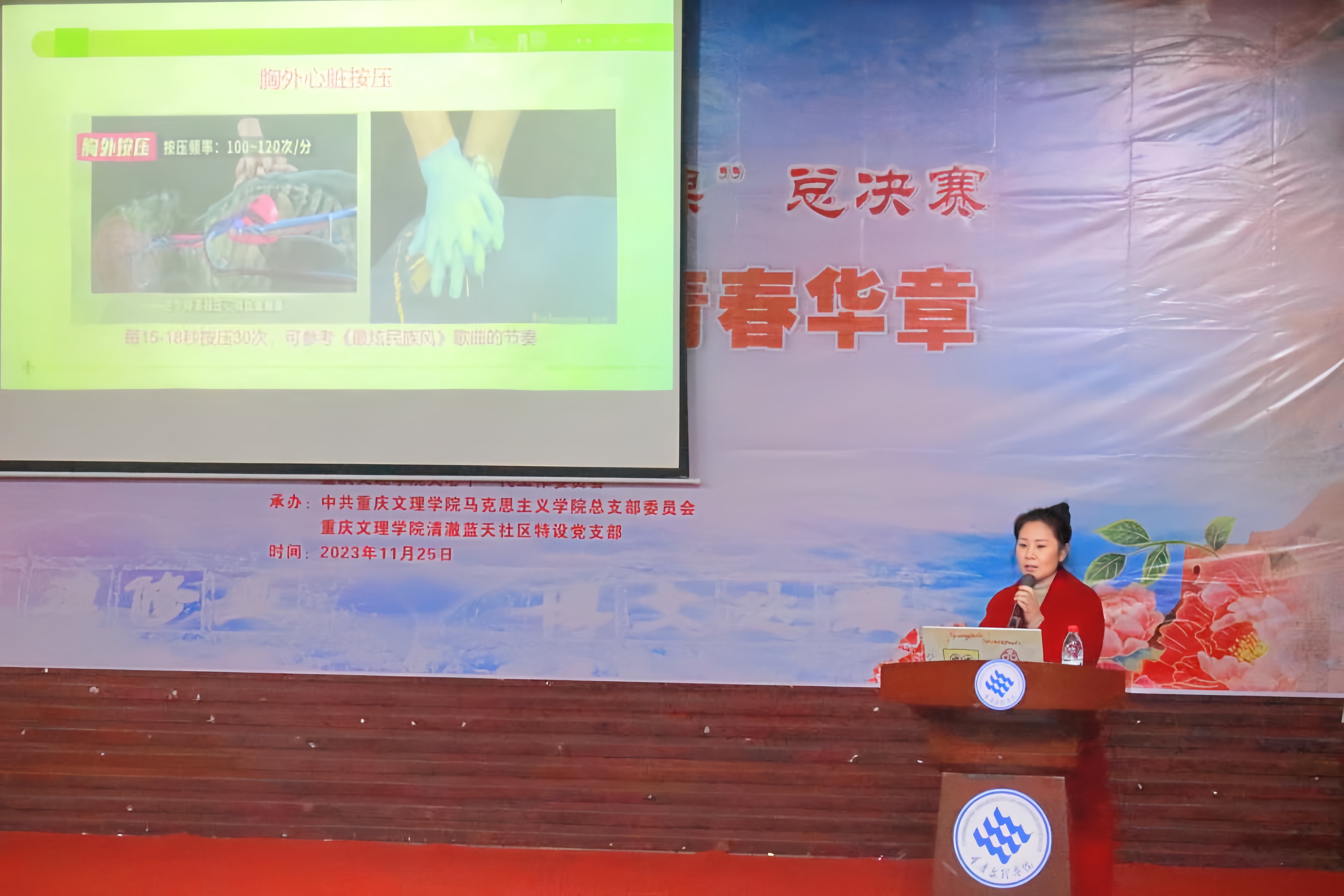 为了进一步提高学生安全意识和普及应急救护知识,11月26日晚,清风揽月学生社区联合学院开展安全教育暨应急救护知识普及宣讲。本次活动特邀重庆医科大学附属永川医院护理部吴修建副主任护师、护士长担任主讲人,学院党总支书记余鹏出席本次活动,学院辅导员及清风揽月学生社区各寝室楼、学院各年级学生代表200余人参与此次活动。